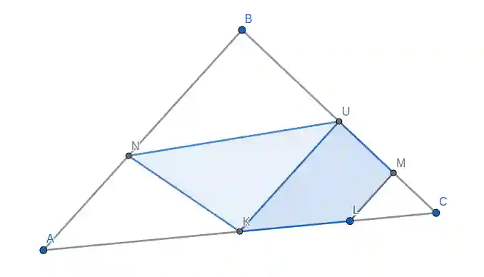 Polski:Na bokach dowolnego trójkąta $ABC$ dane są punkty $K$, $L$, $M$, $N$, $U$: