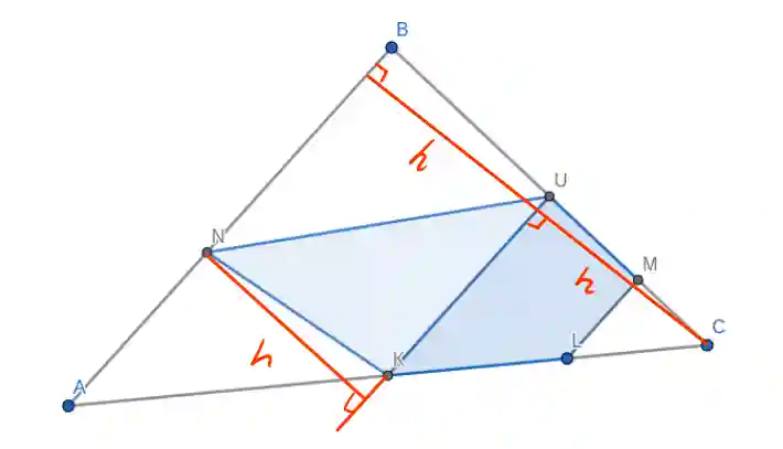 Ale skoro wysokość jest pod kątem prostym oraz $AB\parallel KU$ to możemy powiedzieć, że odległość prostej $AB$ od prostej $KU$ jest równa połowie wysokości opuszczonej na bok $AB$, czyli po prostu $h$.