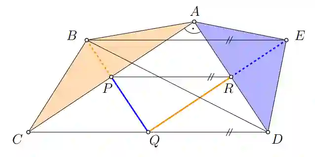 Zauważmy, że $CD\parallel PR$ (znowu używając tego, że $PR$ jest odcinkiem łączącym środki boków). Ale skoro mamy dane, że $CD\parallel BE$, to z tych informacji wynika, że $PR\parallel BE$.